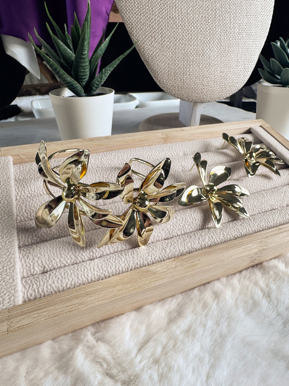 Some designs are made to stand out, and this floral set is one of them. With its golden finish and feminine details, it brings together the elegance of a delicate adjustable bangle and the boldness of maxi earrings — creating a perfect harmony of style and confidence.
