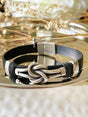 Timeless and versatile, this beautiful unisex bracelet is handcrafted in Spain from high-quality zamak and genuine black leather. Measuring 9”, it blends modern style with artisanal craftsmanship, making it the perfect everyday accessory for any look.