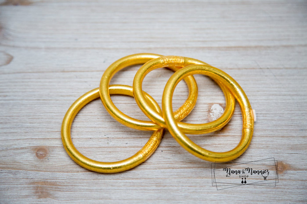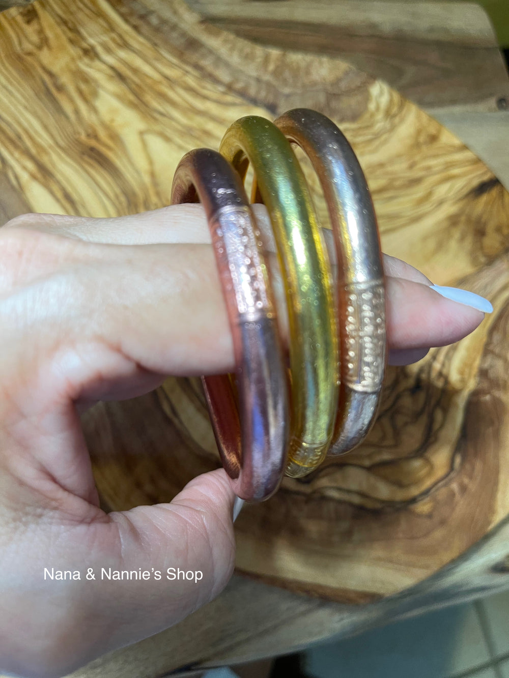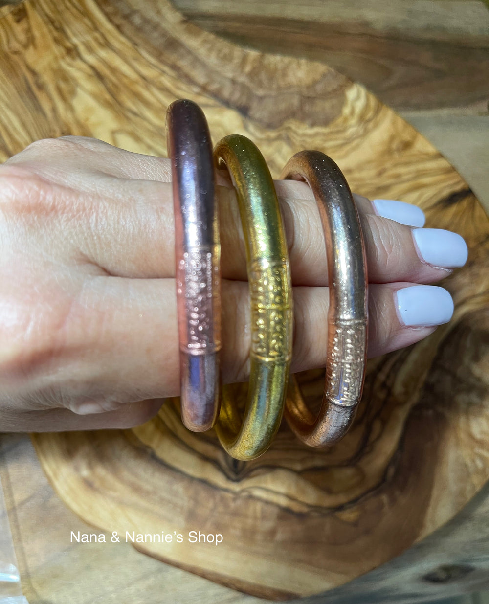 Glow meets elegance in this radiant design. These waterproof bracelets are crafted from polyvinyl material and feature a fine gold dust sheet inside, creating a soft shimmer that captures the light beautifully. Perfect for sunny days, they let you enjoy style and sophistication even at the beach or pool.