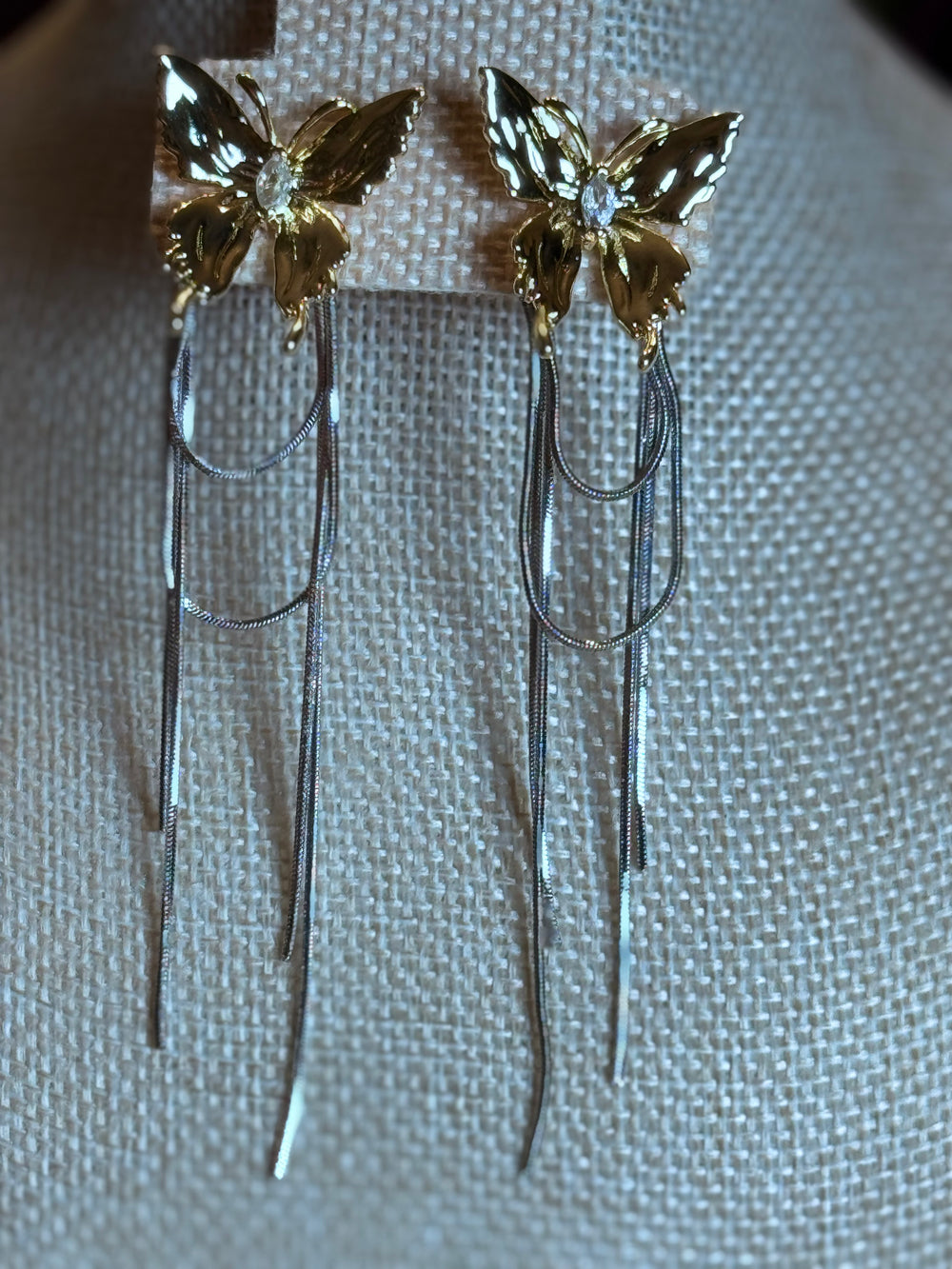 These butterfly earrings combine golden wings with delicate silver chains, creating a graceful flow that feels light, feminine, and unique. A sparkling diamond-like stone at the center adds brilliance, while the fine chains move softly with every step, giving these earrings a luxurious yet modern touch.