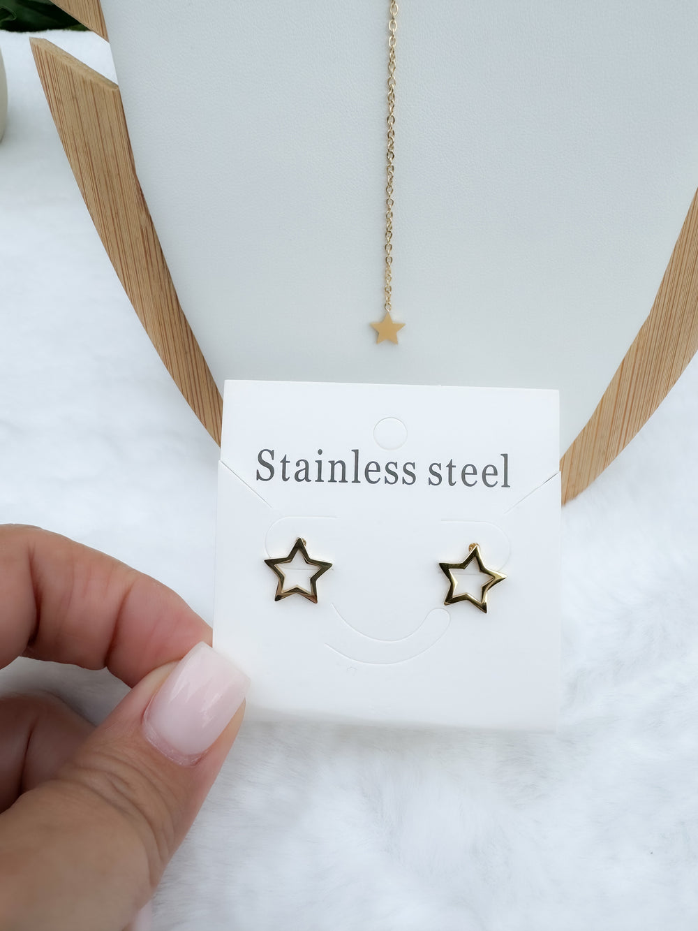 Shine with subtle brilliance. This exquisite stainless steel earring and necklace set captures the beauty of the stars with a refined, modern twist. Available in two elegant options, a complete star or an open star design, each piece radiates delicate sophistication that elevates any look.