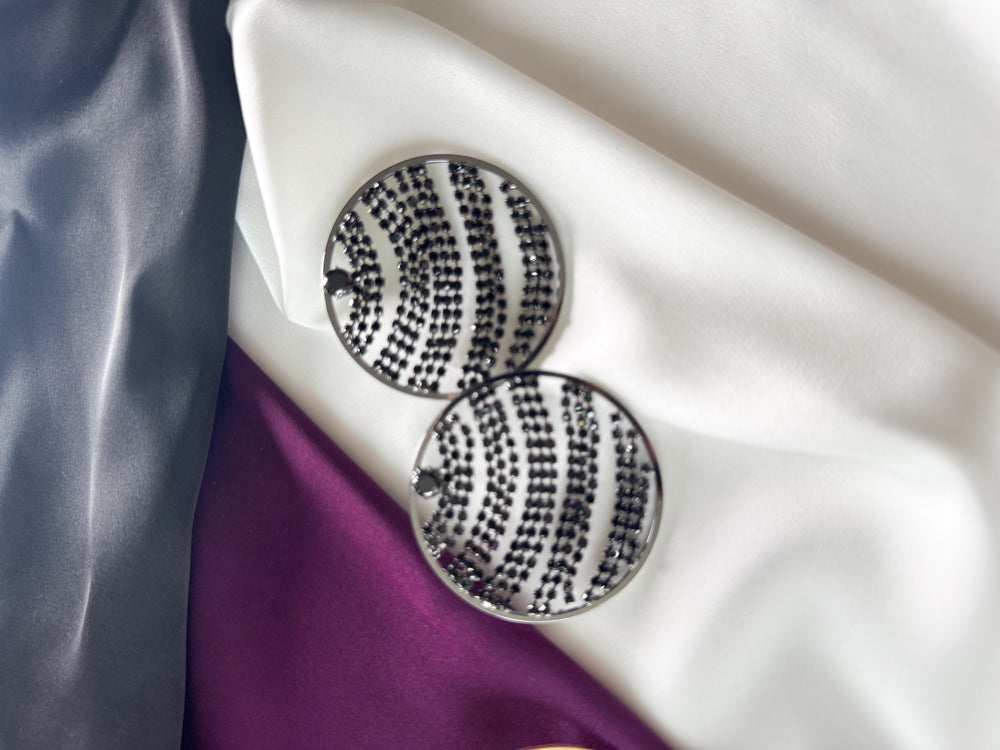 Sleek, sculptural, and designed to shine. These 2" earrings feature an open circular silhouette with three polished horizontal bands, each one delicately encrusted with diamond-like stones for a refined sparkle. Available in gold, silver, or a bold black-on-black version, they strike the perfect balance between contemporary edge and timeless elegance.