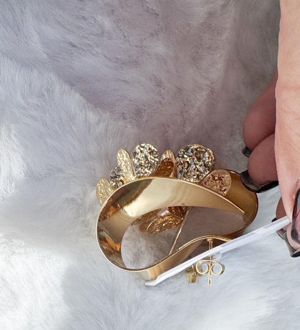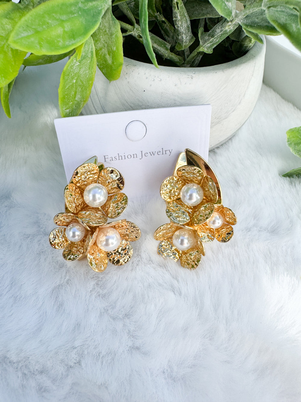 Let your style bloom with grace. These delicate earrings capture the beauty of nature through three softly textured flowers, each radiating elegance and warmth in a graceful gold-tone finish. Their 3D design creates dimension, while the pearl-like center adds a classic, timeless touch.
