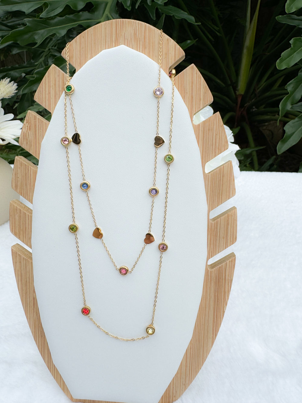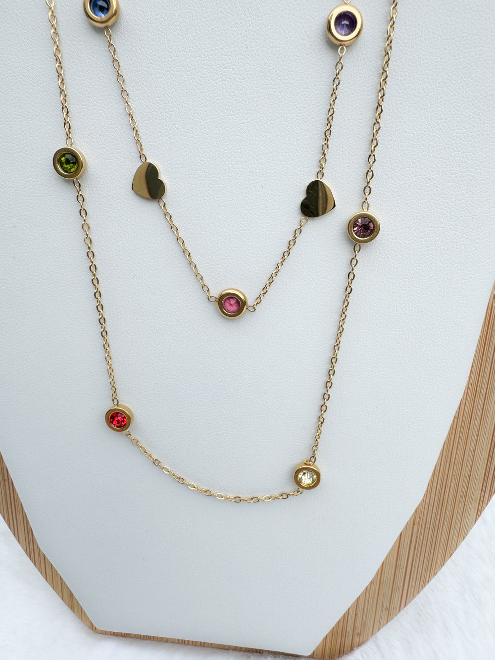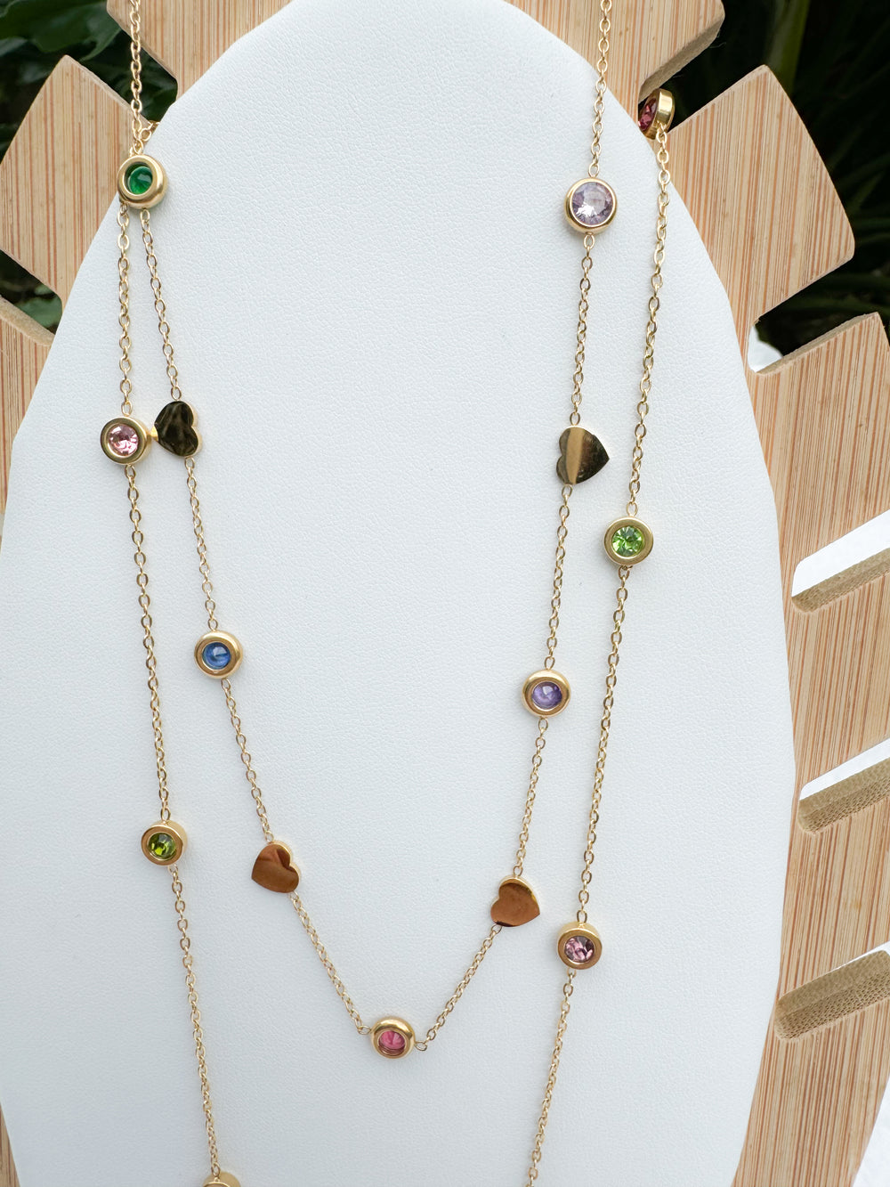 Effortless elegance, reimagined. This stainless steel necklace adorned with delicately hued stones brings sophistication and subtle color to your style. Choose between a bold 24-inch version for a statement look, or a versatile 16-inch design, extendable to 18 inches, featuring charming small hearts that add a touch of romance.