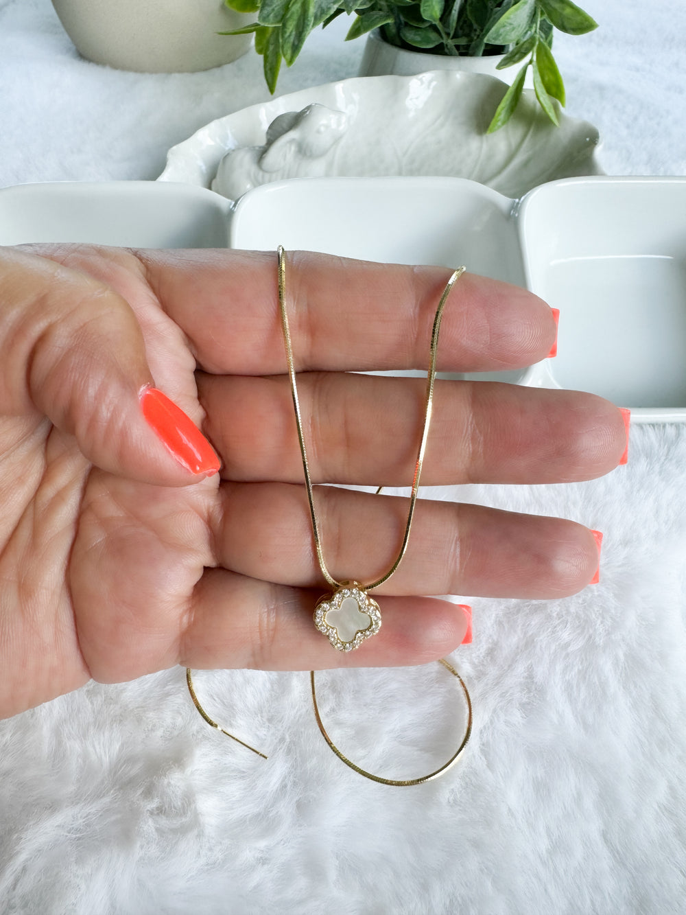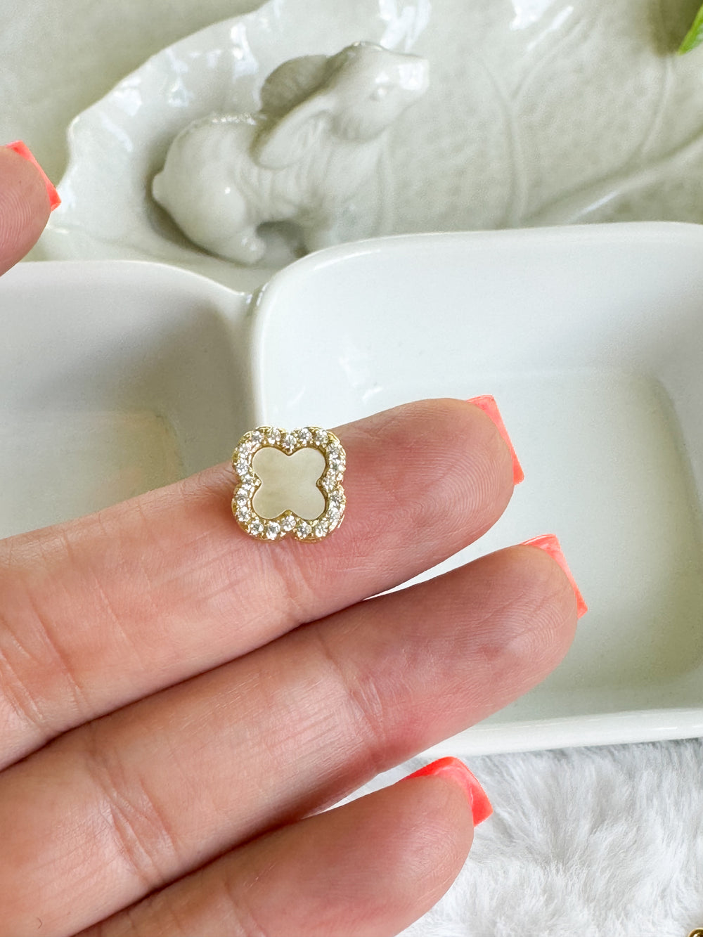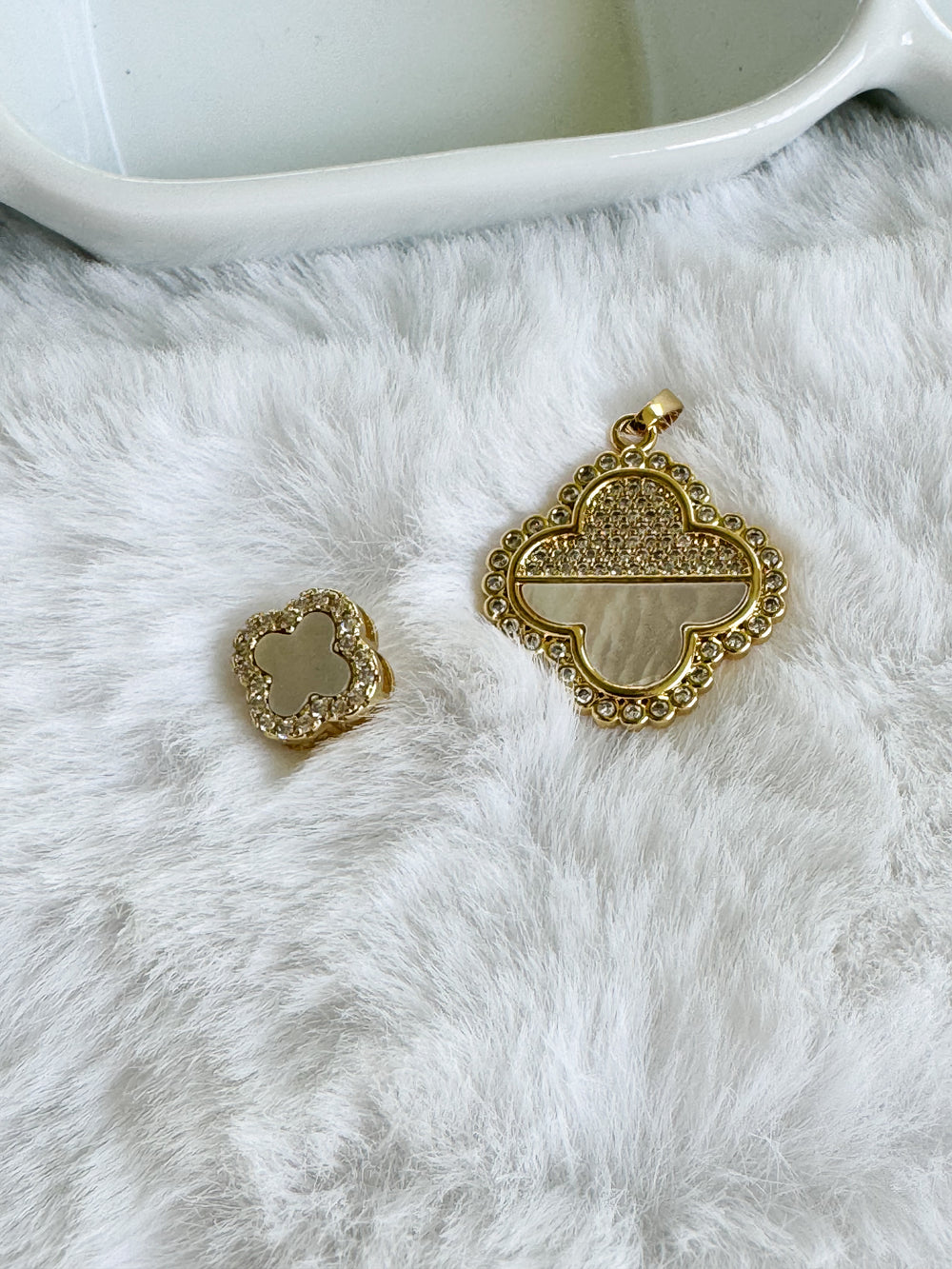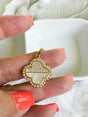 A symbol of timeless charm, and maybe a little luck. This elegant clover charm is designed to elevate any look with its refined details and meaningful beauty. Featuring a luminous white enamel center surrounded by sparkling diamond-simulated stones, each piece is crafted from durable stainless steel with a rhodium-plated finish for long-lasting brilliance.