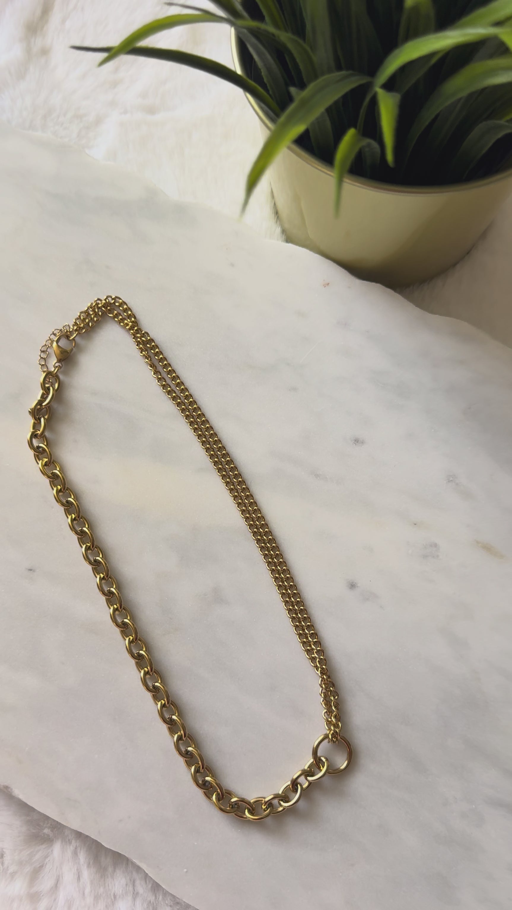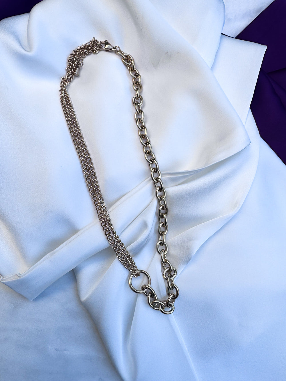 This stainless steel necklace is designed to blend durability with refined elegance, featuring two distinct chain styles in one seamless piece. The combination creates a layered, elevated look without the effort—bringing dimension, shine, and sophistication to any outfit. Its smooth, luminous finish adds a polished touch, while the adjustable length offers versatility for every neckline and occasion.
