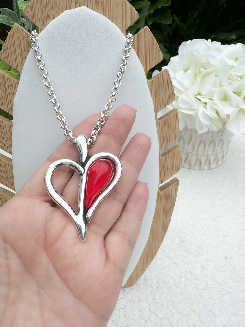 - Design: Heart pendant with resin center
