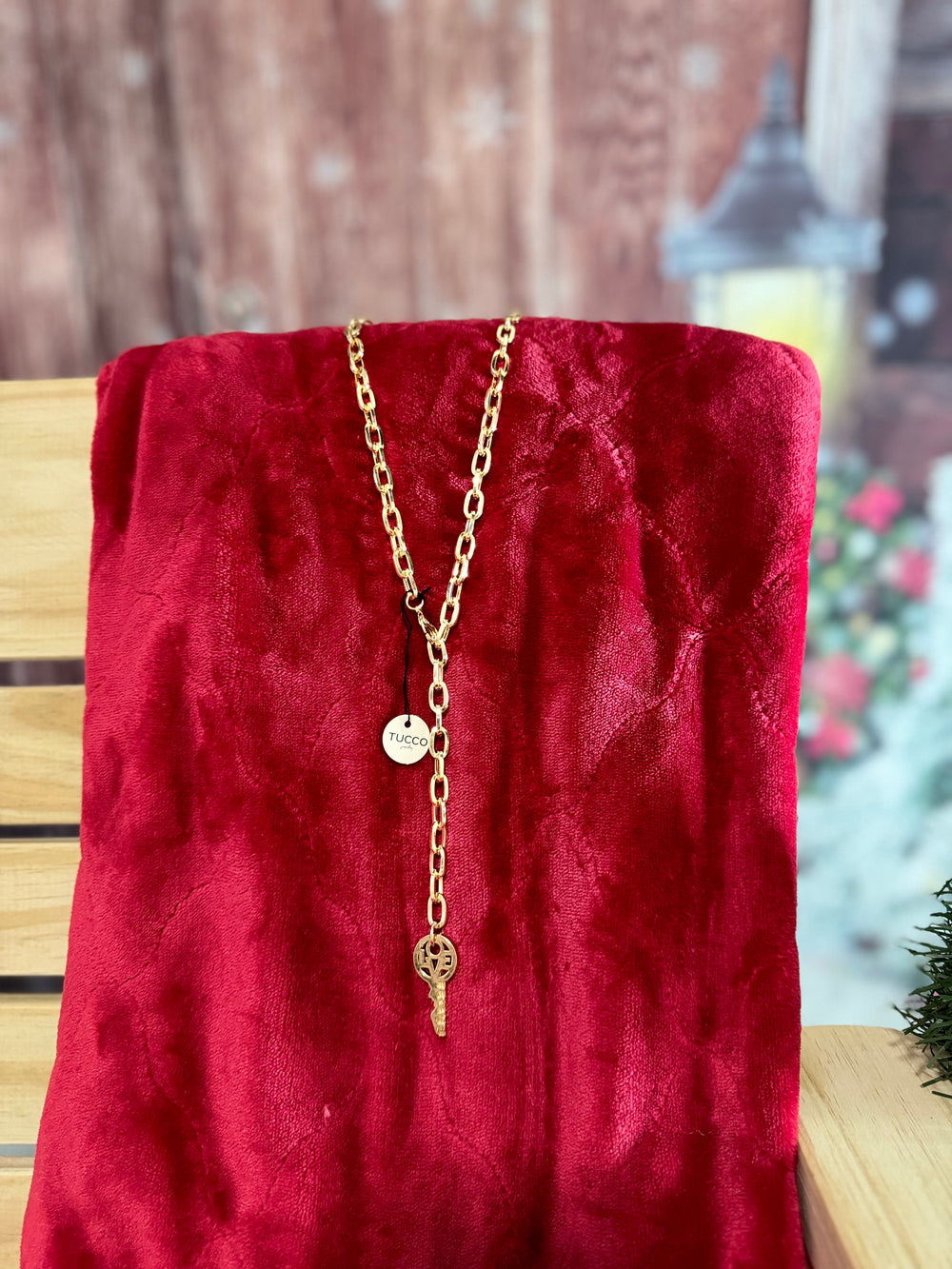 Timeless elegance with a golden touch. This beautiful 24” necklace, handcrafted in Spain from high-quality zamak and finished in radiant gold plating, features a delicate 1½” key charm a symbol of dreams and new beginnings. Adjustable for the perfect fit, it’s a refined piece that adds sophistication to any outfit.