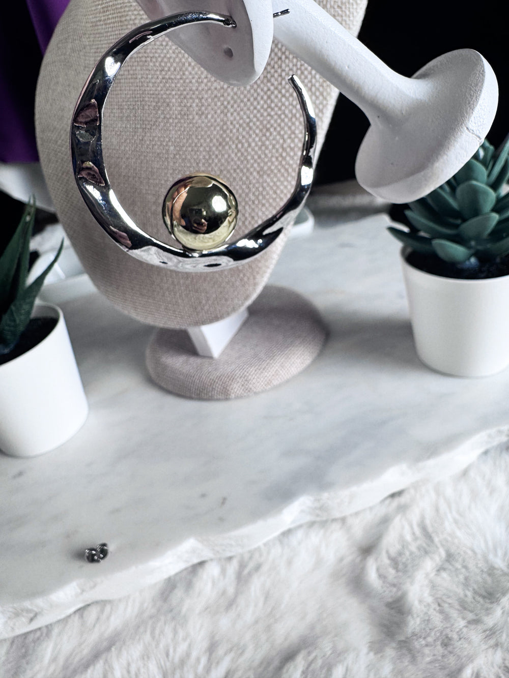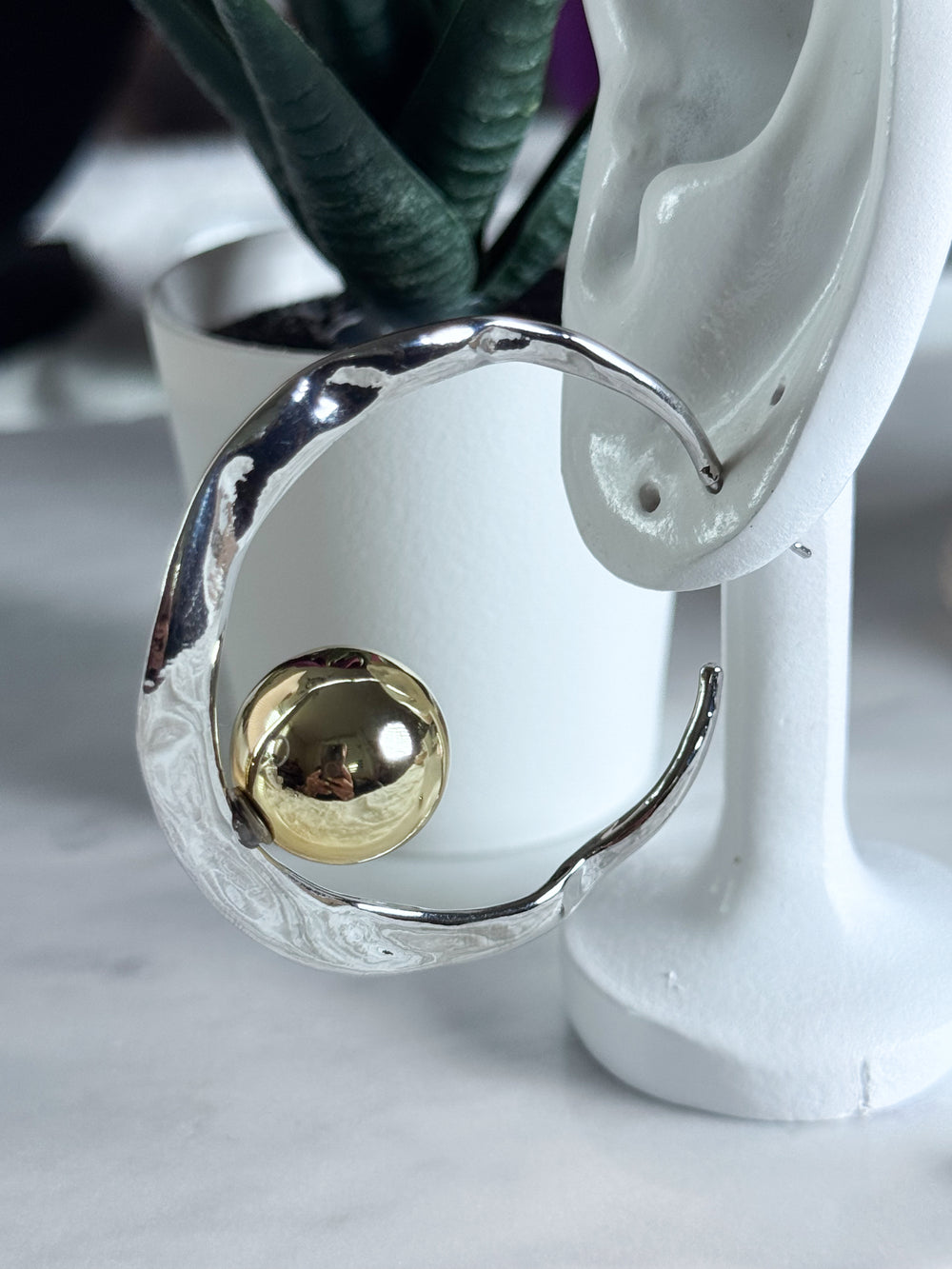 Effortless sophistication begins with the right details. These two-tone open hoops blend modern minimalism with a touch of golden warmth, making them the perfect choice for a polished yet versatile look. Their fluid, three-quarter design adds a contemporary twist to a classic silhouette, while the golden bead catches the light with every movement.