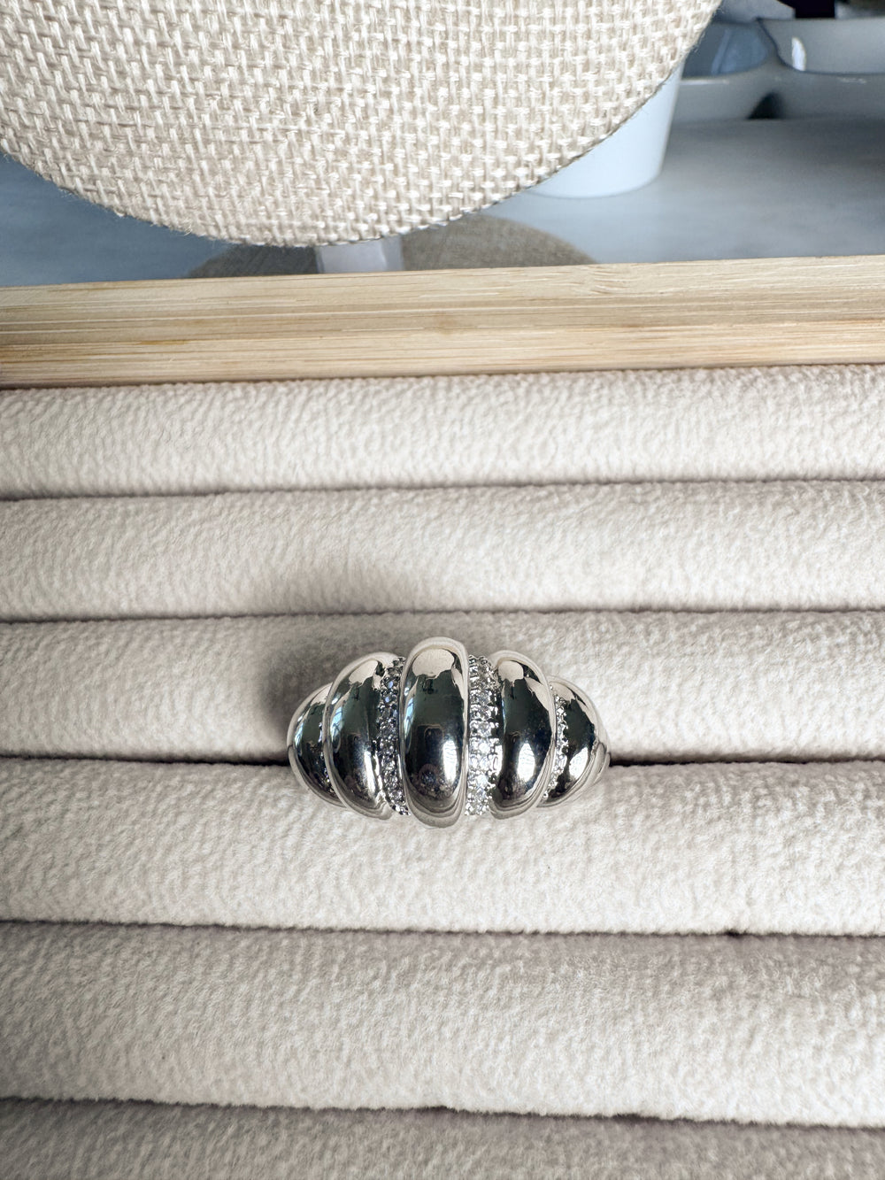 Some rings aren’t just accessories, they’re statements. This bold, two-texture design captures light beautifully, blending raised, polished detail with a recessed band of sparkling stones that mimic the brilliance of diamonds. It’s the perfect balance of strength and elegance, made for the woman who owns her style day and night.