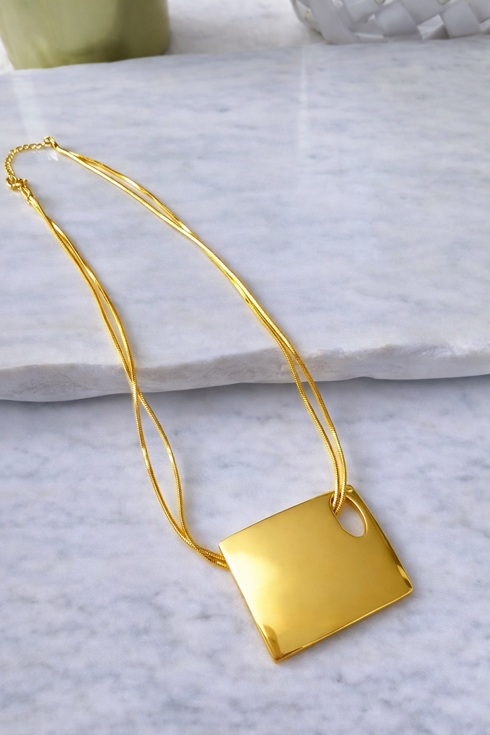 This double-chain necklace, crafted in stainless steel with rhodium plating, blends clean geometry with soft shine for a piece that feels both contemporary and timeless. Its sleek square centerpiece adds a refined architectural touch, while the layered chain design creates natural dimension that enhances the neckline without feeling heavy.
