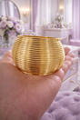 The Élan Textured Statement Bangle features a wider, structured silhouette enhanced by a rich textured finish that adds depth and dimension. Its radiant gold tone, achieved through rhodium-plated stainless steel, reflects light beautifully, creating a luxurious presence that feels both modern and timeless.