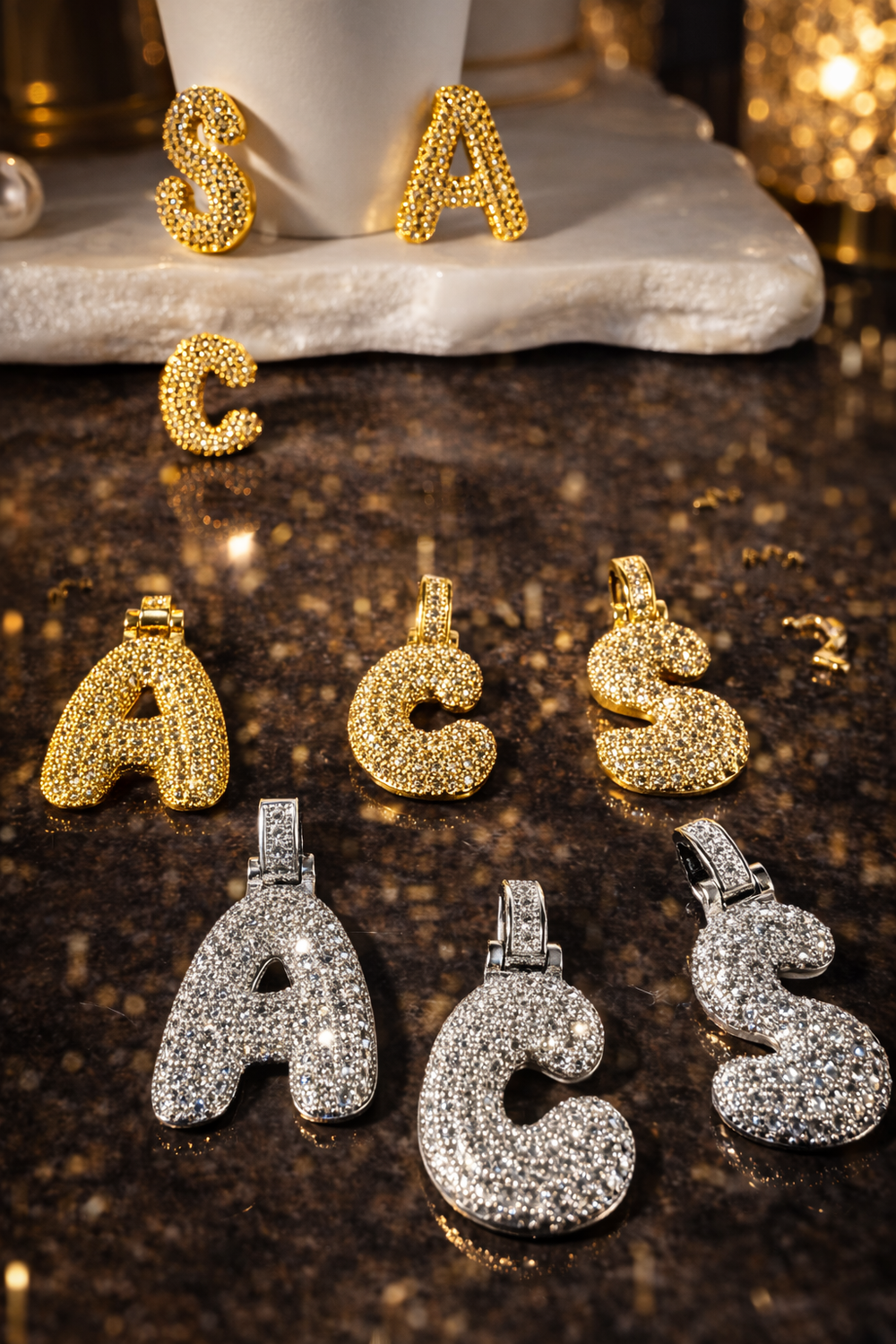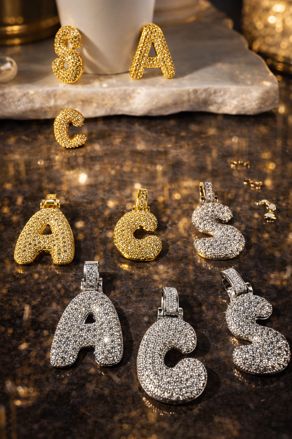 The first two styles allow the chain to slide through the sides of the letter, giving it a shorter, closer-to-the-neck appearance. The third style features an integrated top hanger, enhancing length and creating a more defined vertical drop.