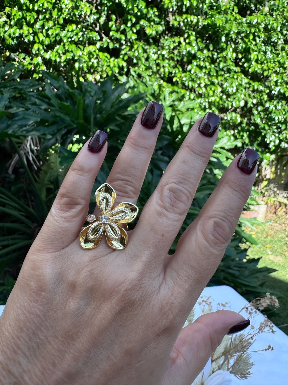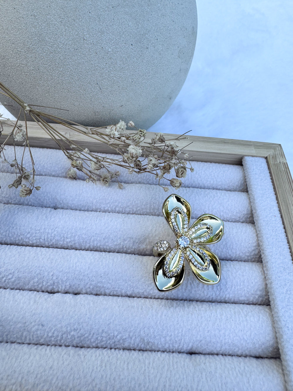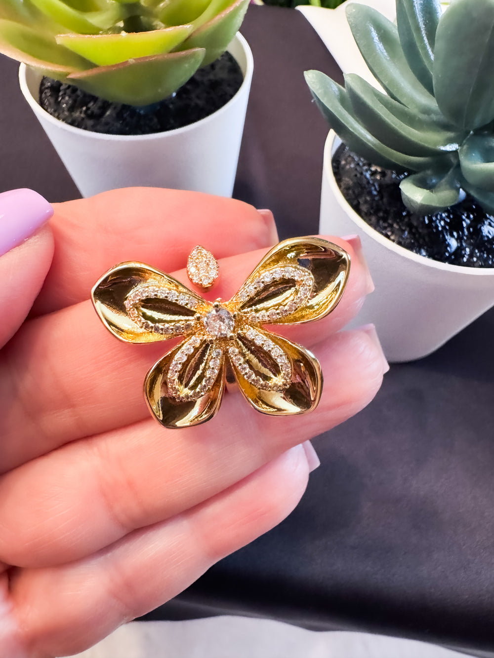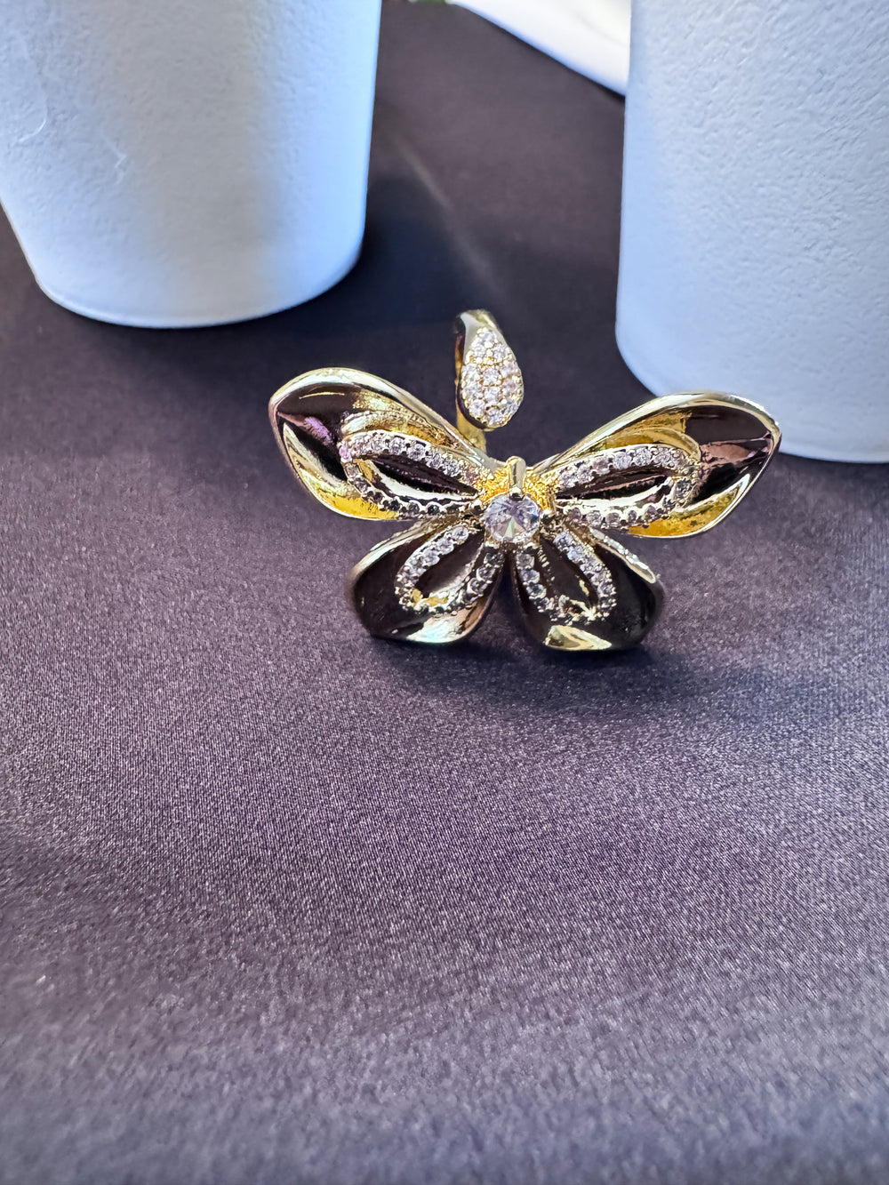 Transformation starts in the details. This butterfly-inspired ring captures that energy with an outline encrusted in shimmering diamond-like stones, anchored by a single crystal that draws the eye in. From its sculpted centerpiece to the stone-lined adjustable closure, every angle glows with intention.