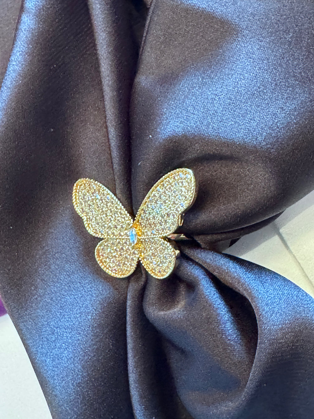 - Design: Raised butterfly outline with pavé detailing and central crystal