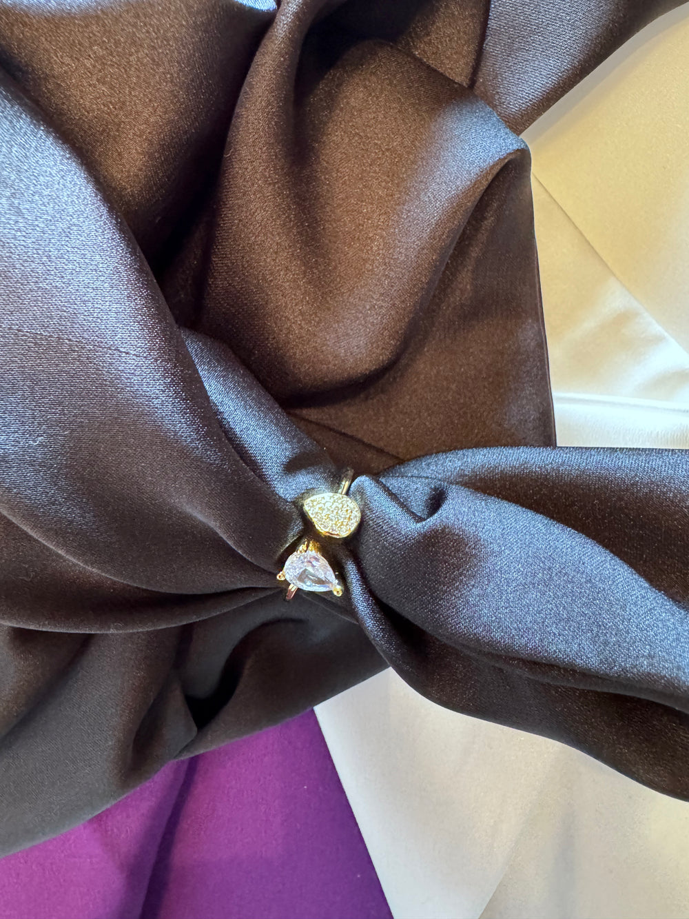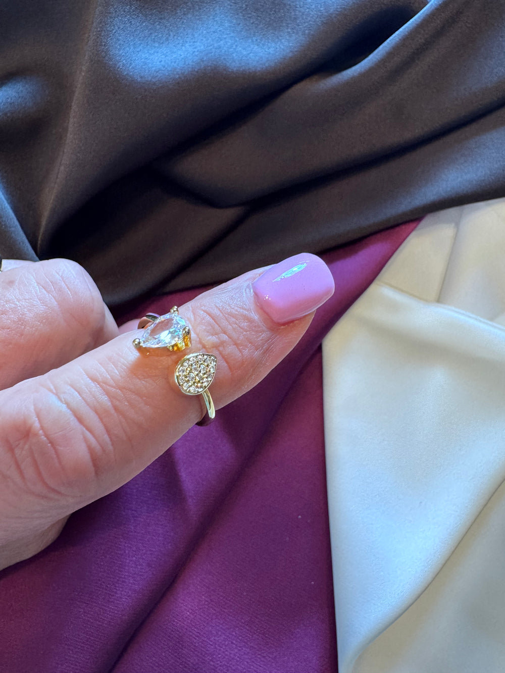 Some pieces are made to spark conversation. This elegant adjustable ring features a striking dual-drop design, combining the brilliance of a single diamond-like stone with the texture of pavé detailing. Its golden glow and modern shape add just the right amount of edge to your everyday elegance.