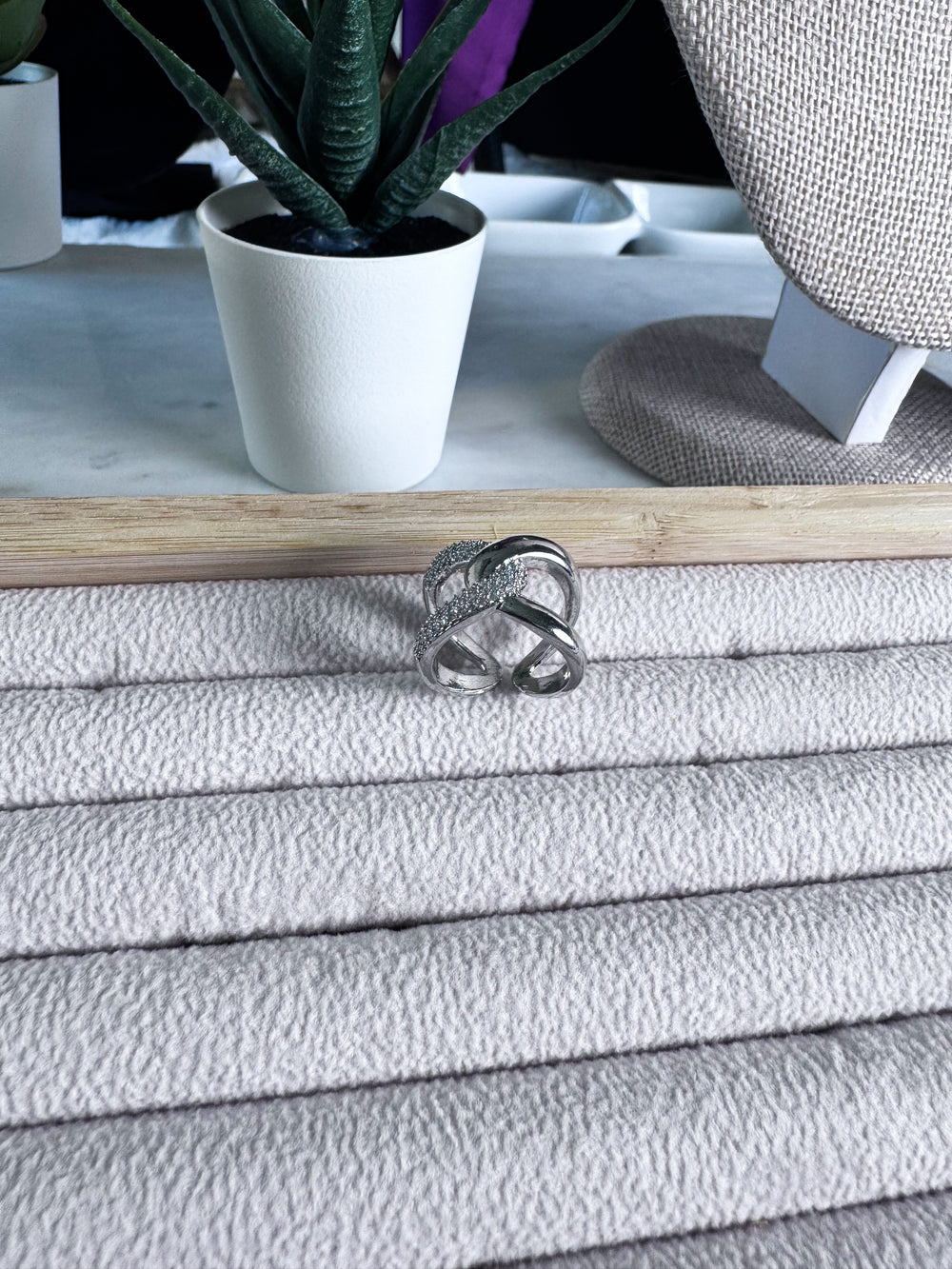 Minimalist beauty meets subtle sparkle—this open band ring is designed for effortless everyday elegance. Its intertwined design reveals glimpses of skin, while the contrast between a sleek polished band and a shimmering row of diamond-like stones creates a refined, contemporary look.