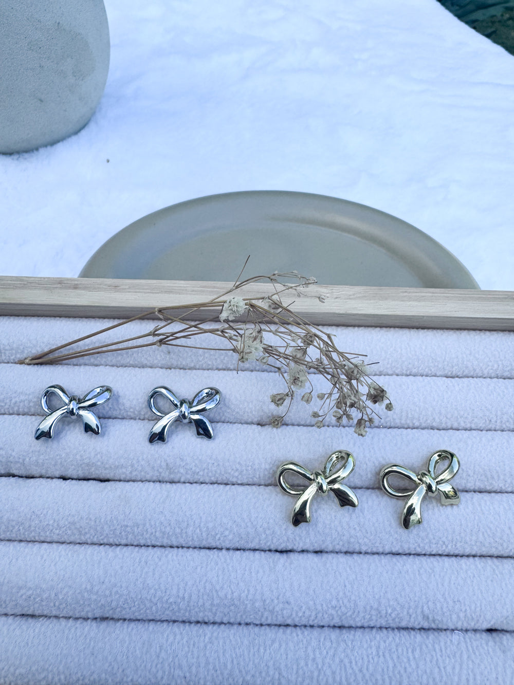 - Design: Bow-shaped studs with clean, minimalist lines