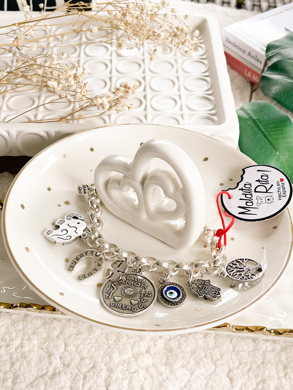 This is a handmade bracelet crafted in Spain from zamak, available in both gold-plated and non-gold-plated finishes. It features various Spanish traditional charms symbolizing luck, such as the third eye (tercer ojo), tree of life, elephant, and the clover leaf, among others. Each bracelet is unique due to its handcrafted nature.