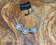 Made with zamak, elastic bracelet, has 3 round circle with white beads inside