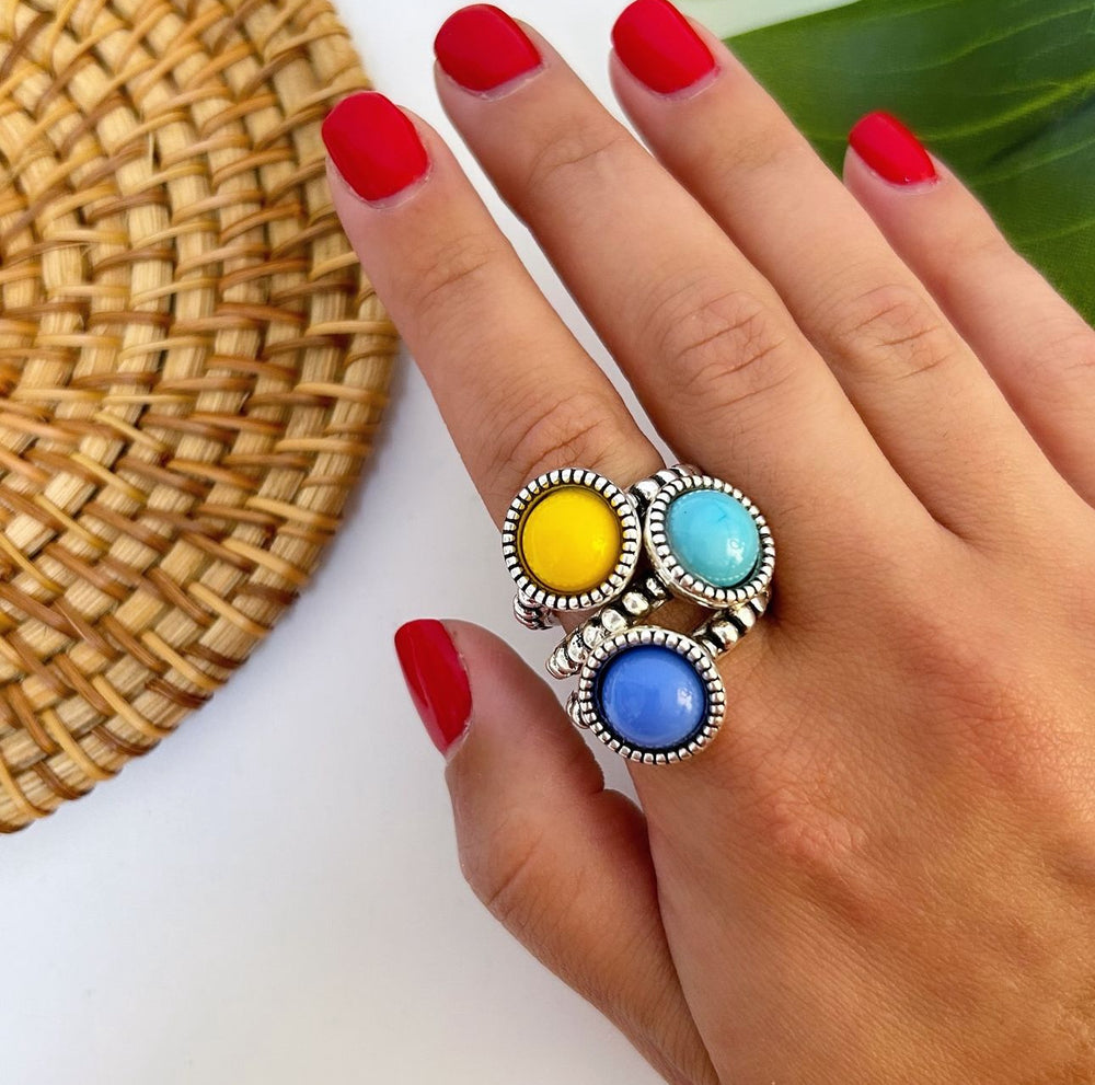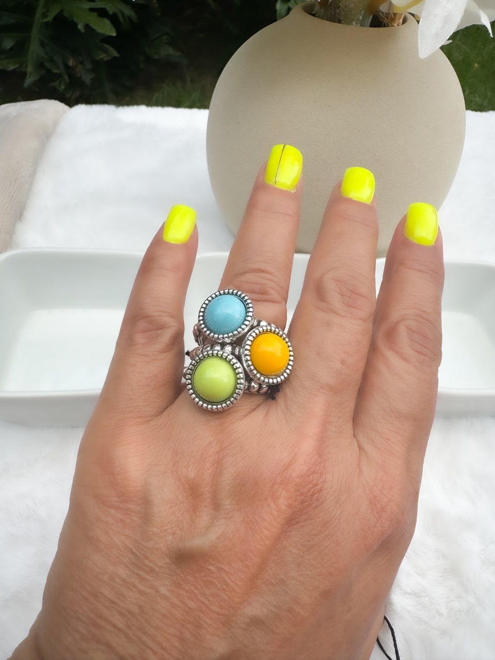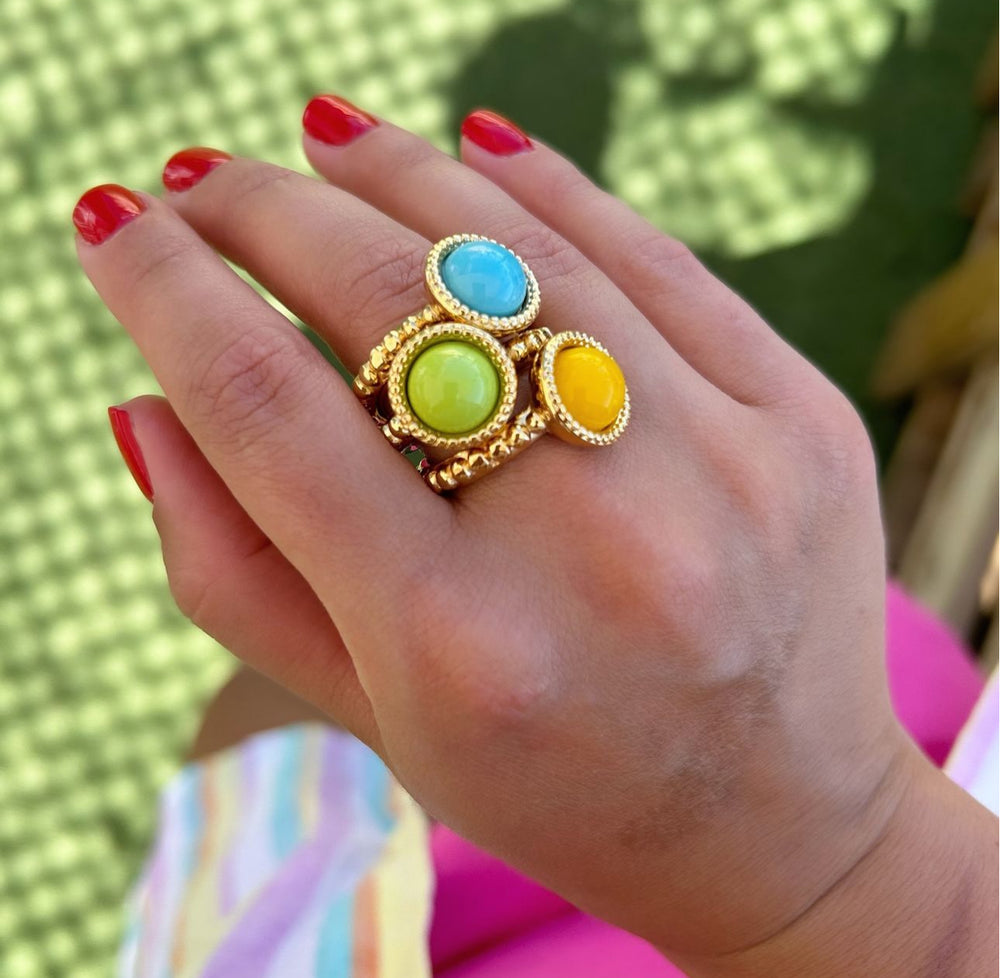 Soft color, timeless charm. This adjustable ring adorned with pastel gemstones captures the essence of elegance with a playful touch of color. Designed to blend luxury and versatility, it’s the perfect piece to brighten any look with effortless sophistication.
